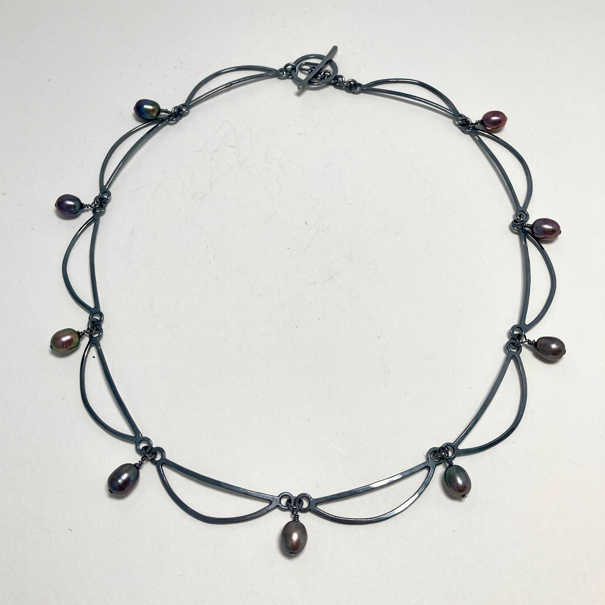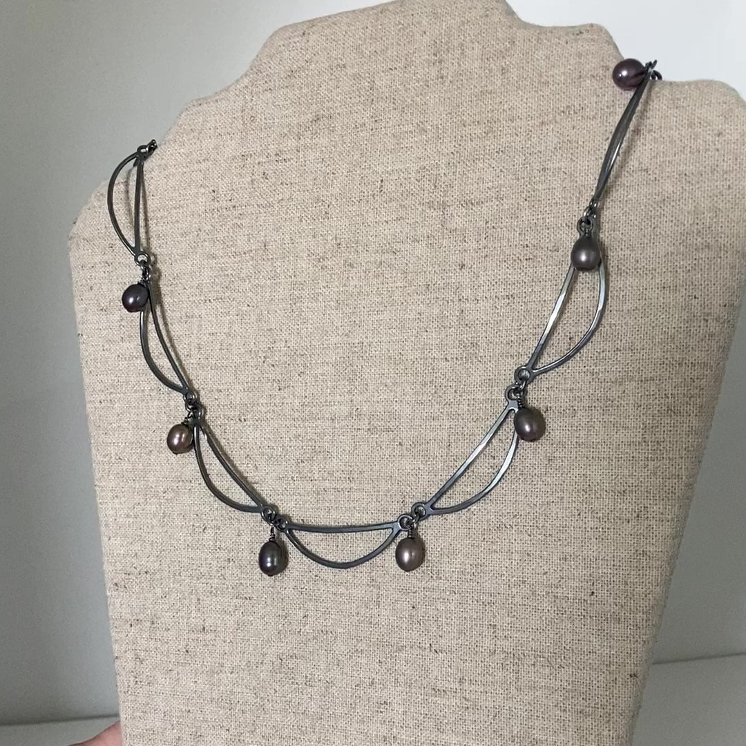 Swag chain with pearls, this time in Black! Sterling silver that has been blackened and polished to enhance the shine and beauty of the freshwater pearls that are scattered among the links. The necklace measures approximately 17 inches in length, each link is hand hammered for a comfortable fit. I LOVE blackened sterling silver! It’s so easy to care for. I just wash it once in a while with dish soap to remove makeup and stuff that it picks up from wear.