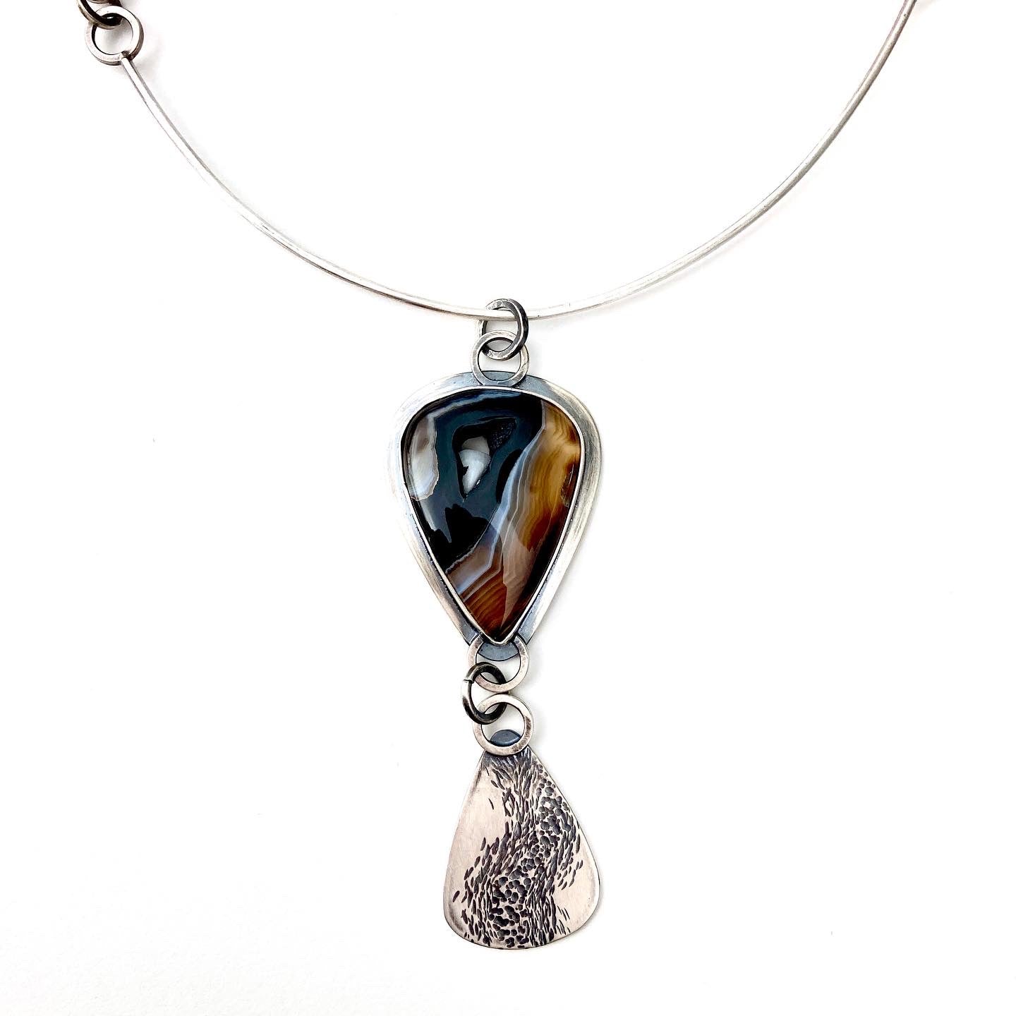 This unique Agate has another stone embedded in its heart. I opened the back of the setting so that you could look through it. It made me think of a creek as it flows around rocks so I mimicked the lines with a hammered texture on the charm that hangs below. It hangs on a handmade collar/chain at about 18 inches long.