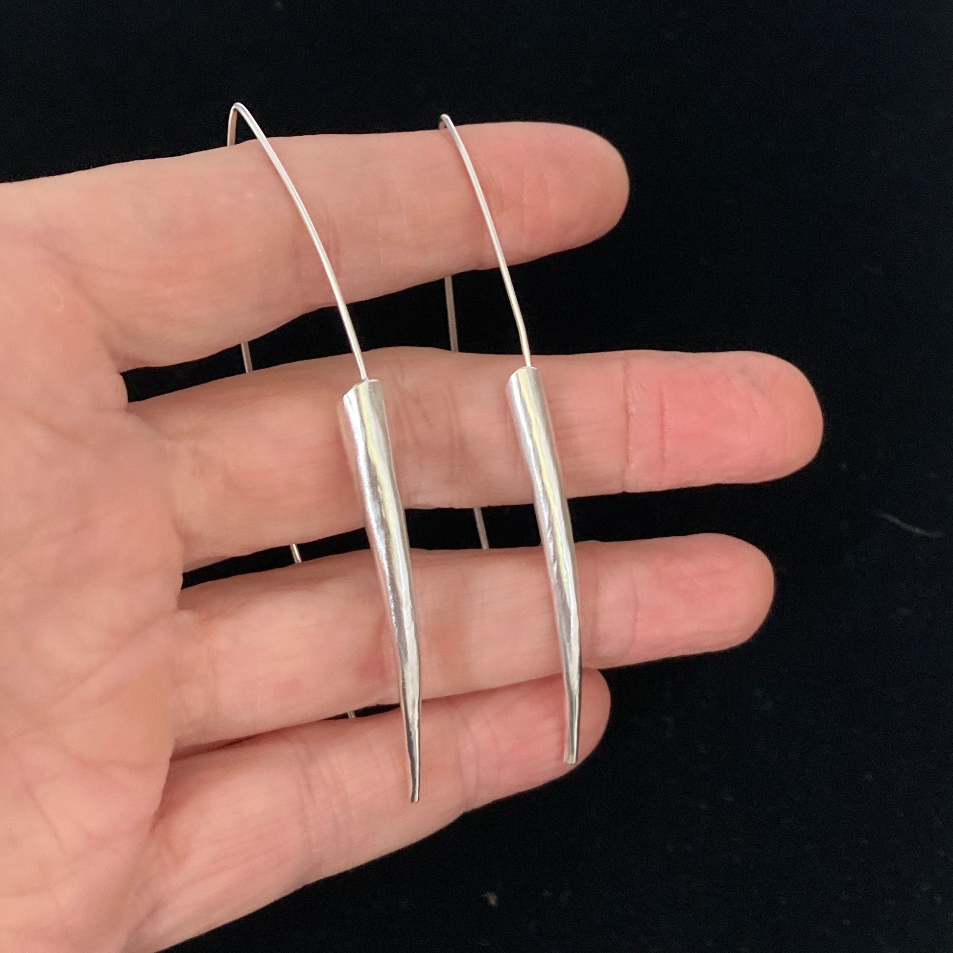 These Sterling silver earrings are not for the faint of heart. At 3 inches long they are the thigh high boots of earrings. Super light due to the hand forged hollow shapes. They will certainly get attention.