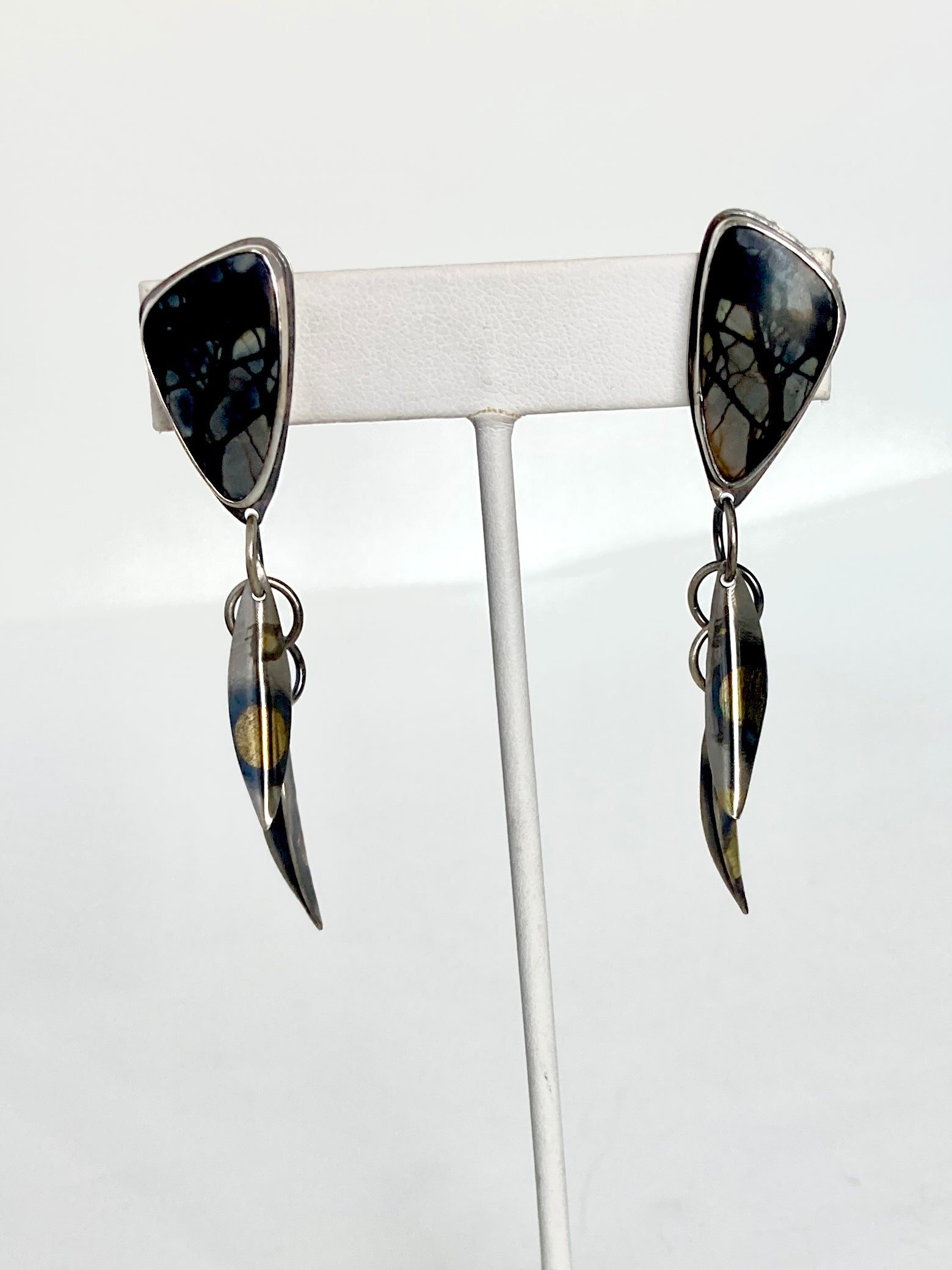 Picasso Jasper set in sterling silver post earrings embellished with silver leaf shapes that have 24k gold spots applied using an ancient Korean technique called Keum Boo.
