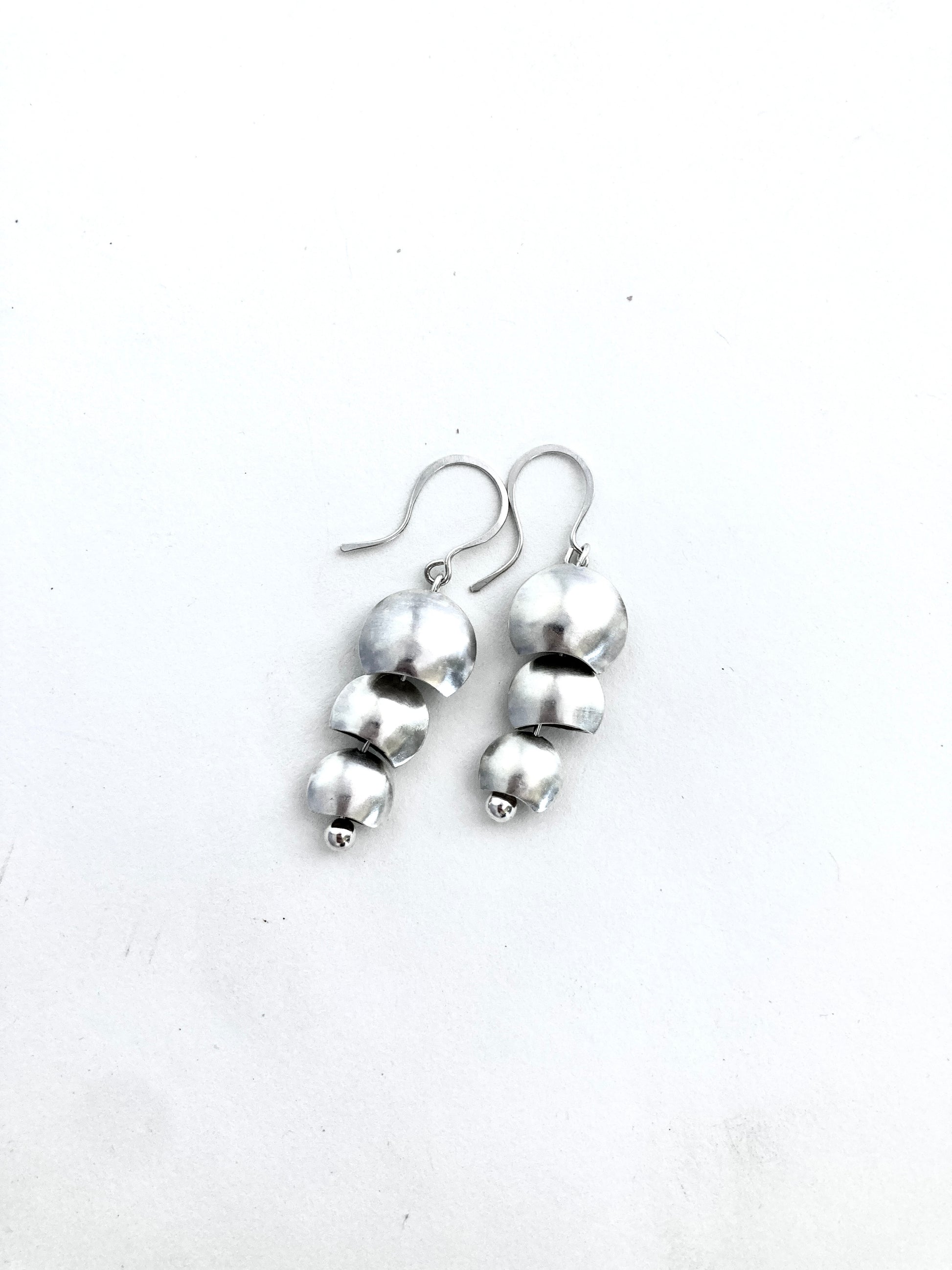 Three silver bells in graduating sizes dangle enticingly as they create a tiny song. These sterling silver earrings hang two inches long from the top of the earwire.