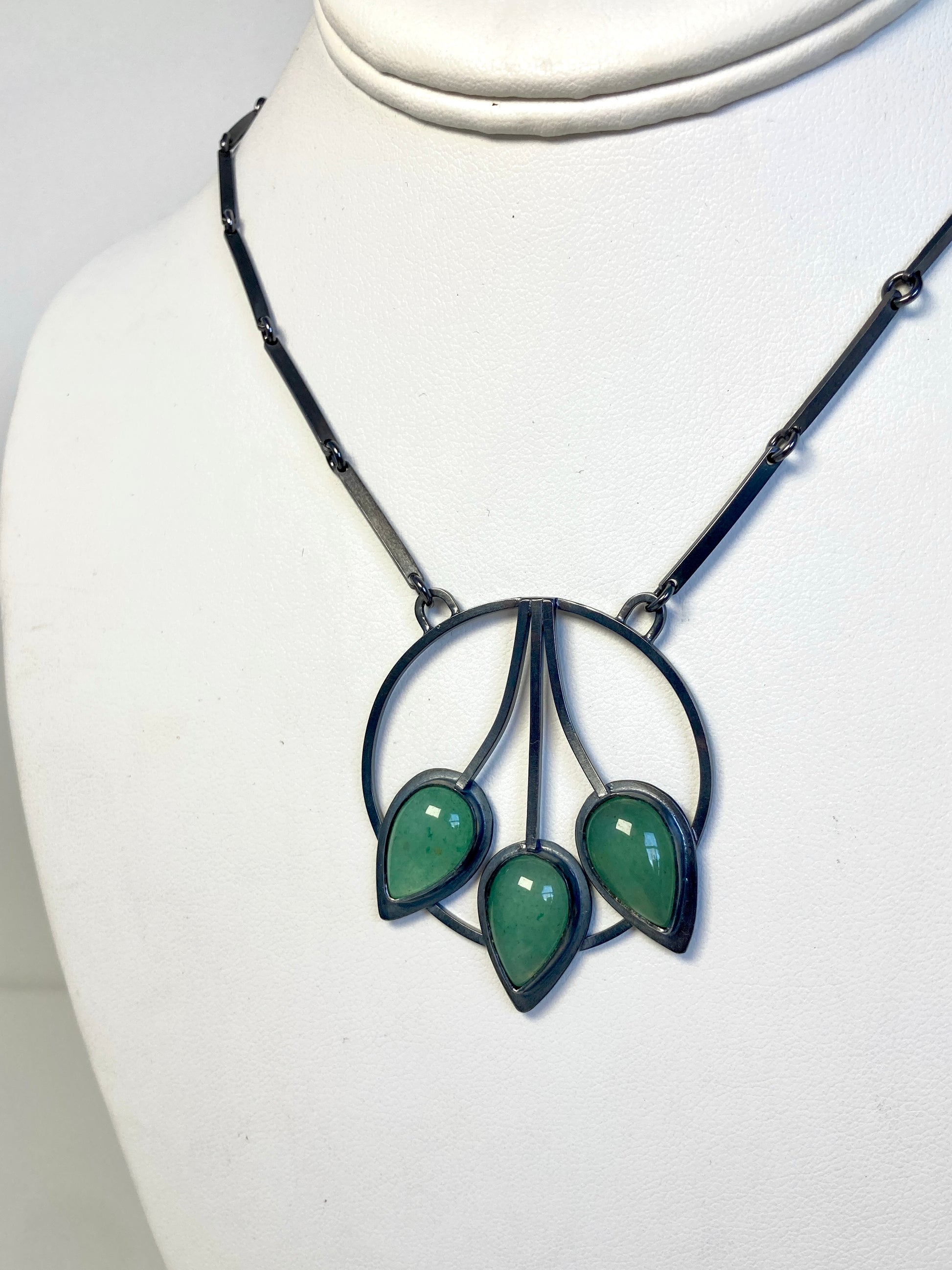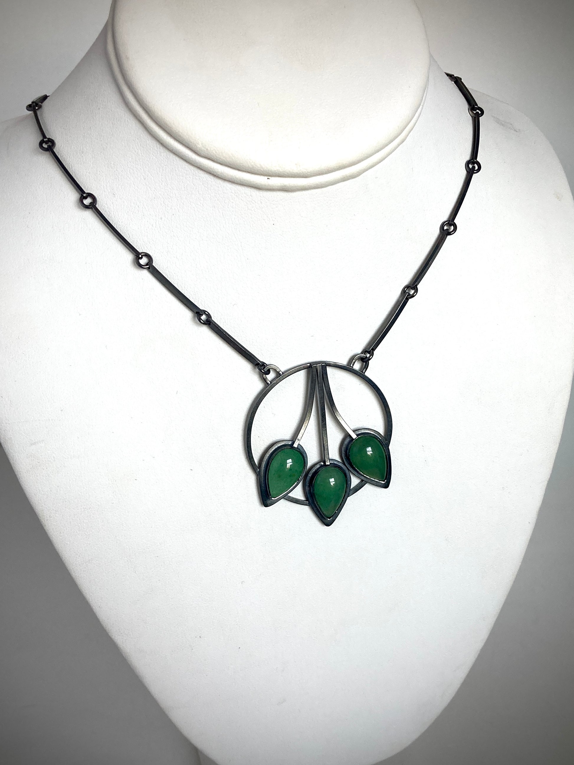 Blackened Sterling silver with three leafy aventurine stones pendant on a hand forged chain. Easy to care for, no polishing required! Just wash with dish soap the remove makeup, etc.